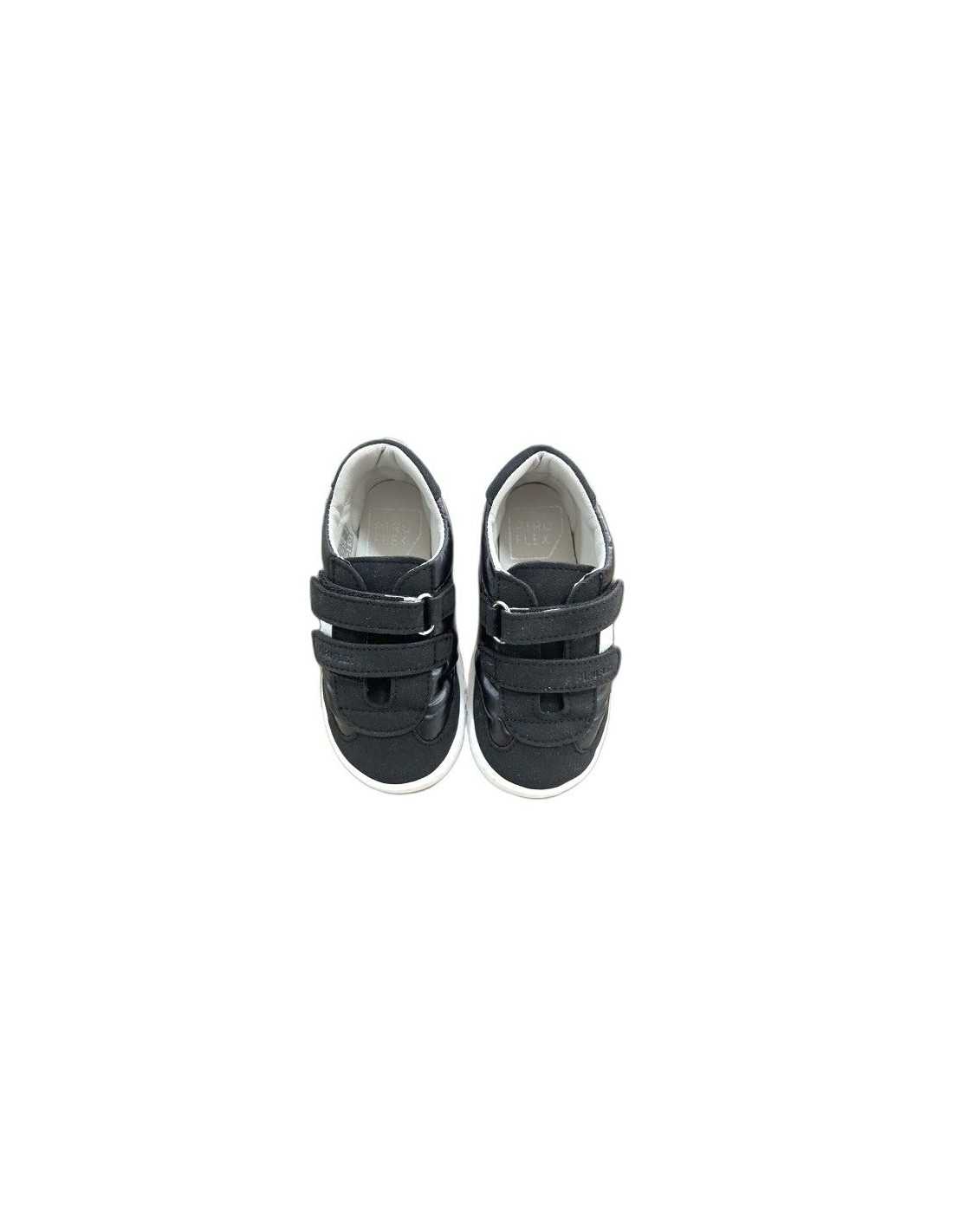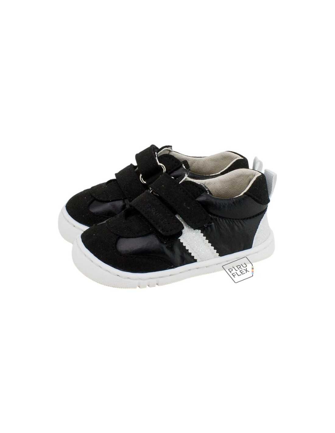 Zapatillas deportivas Piruflex de calzado respetuoso, con suela flexible y puntera amplia para mayor comodidad. Cuentan con plantilla extraíble y cierre de velcro que facilita la autonomía de los peques. Fabricadas en nylon negro con detalles en blanco, combinan durabilidad y estilo para un ajuste cómodo y saludable.