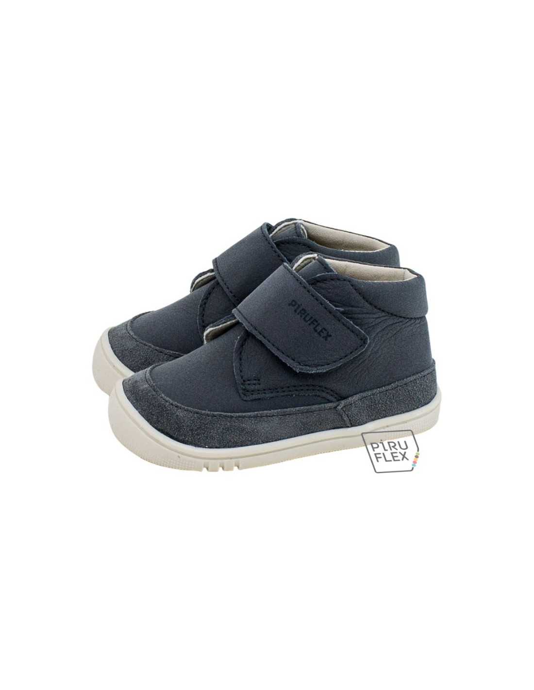 Botines respetuosos Piruflex, ideales para el otoño-invierno, en color Davinci Night con detalles en serraje antracita. Están fabricados con materiales de alta calidad, ofreciendo una suela flexible, puntera amplia y plantilla extraíble.