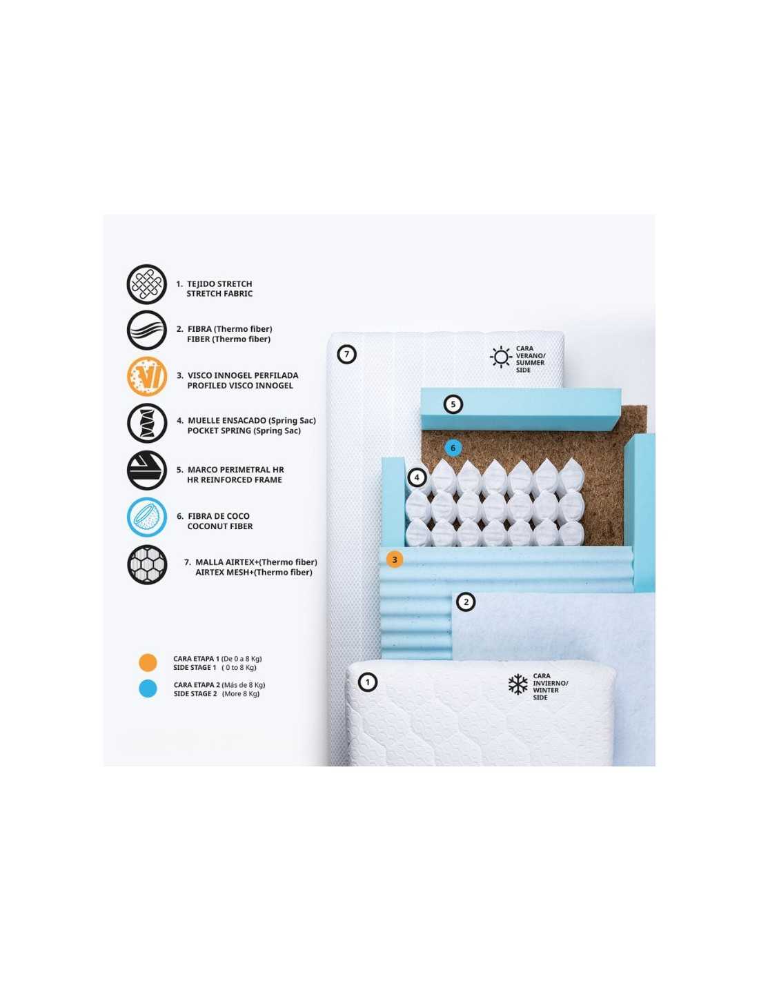 - Colchón 2 etapas: En la primera etapa (0 a 8 kg. Aprox.) el colchón es más suave adaptándose a las necesidades de desarrollo del bebé durante estos primeros meses. En la segunda etapa el colchón presenta una mayor firmeza para que el desarrollo óseo del bebé se genere de forma correcta y su columna se vaya alineando adecuadamente. Estas 2 etapas vienen marcadas en el interior del colchón.