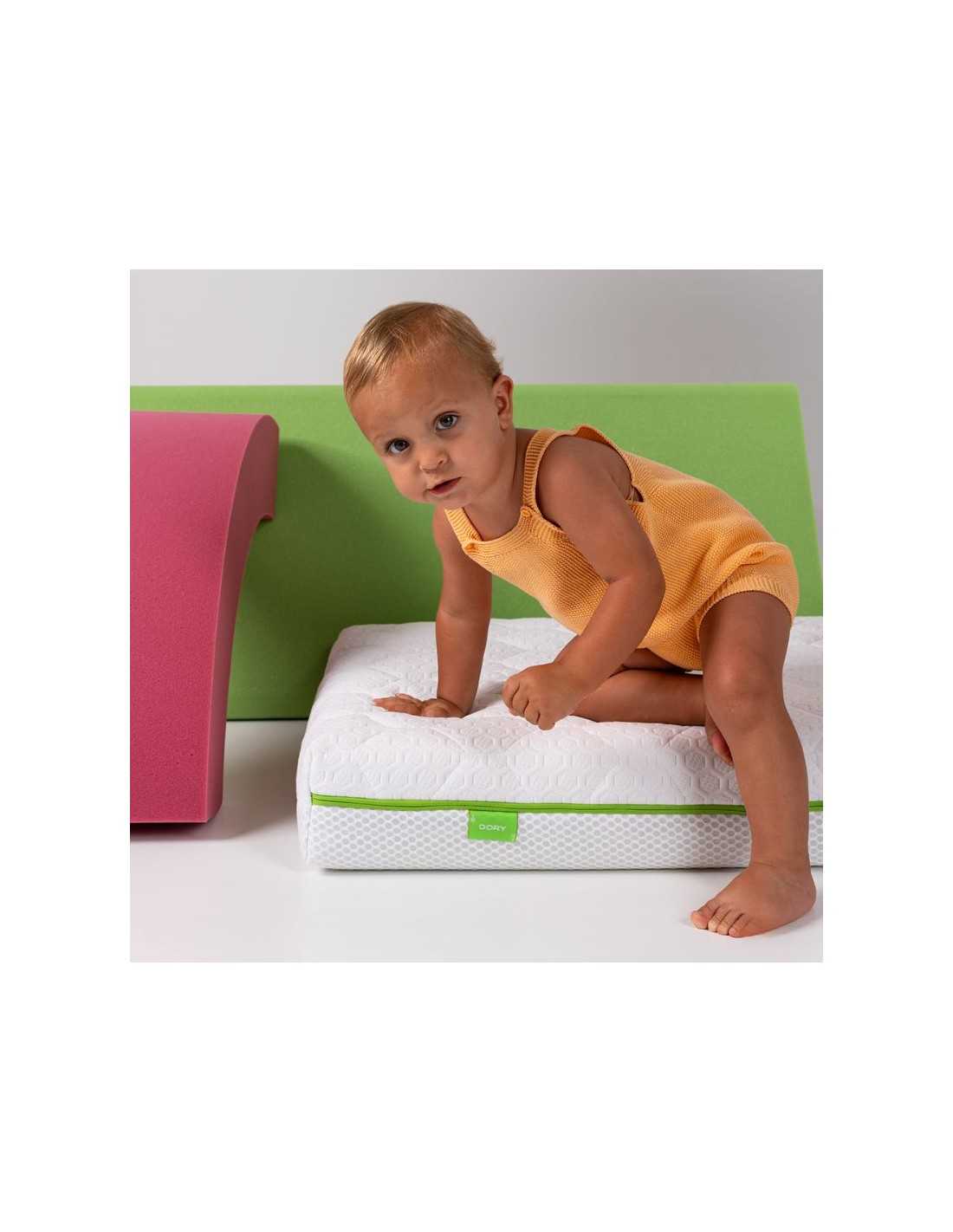Es un colchón cuna de bebé de doble etapa, es decir para cada época del desarrollo del bebé. Una etapa más suave para sus primeros meses y otra más firme para una correcta alineación de la columna del bebé.