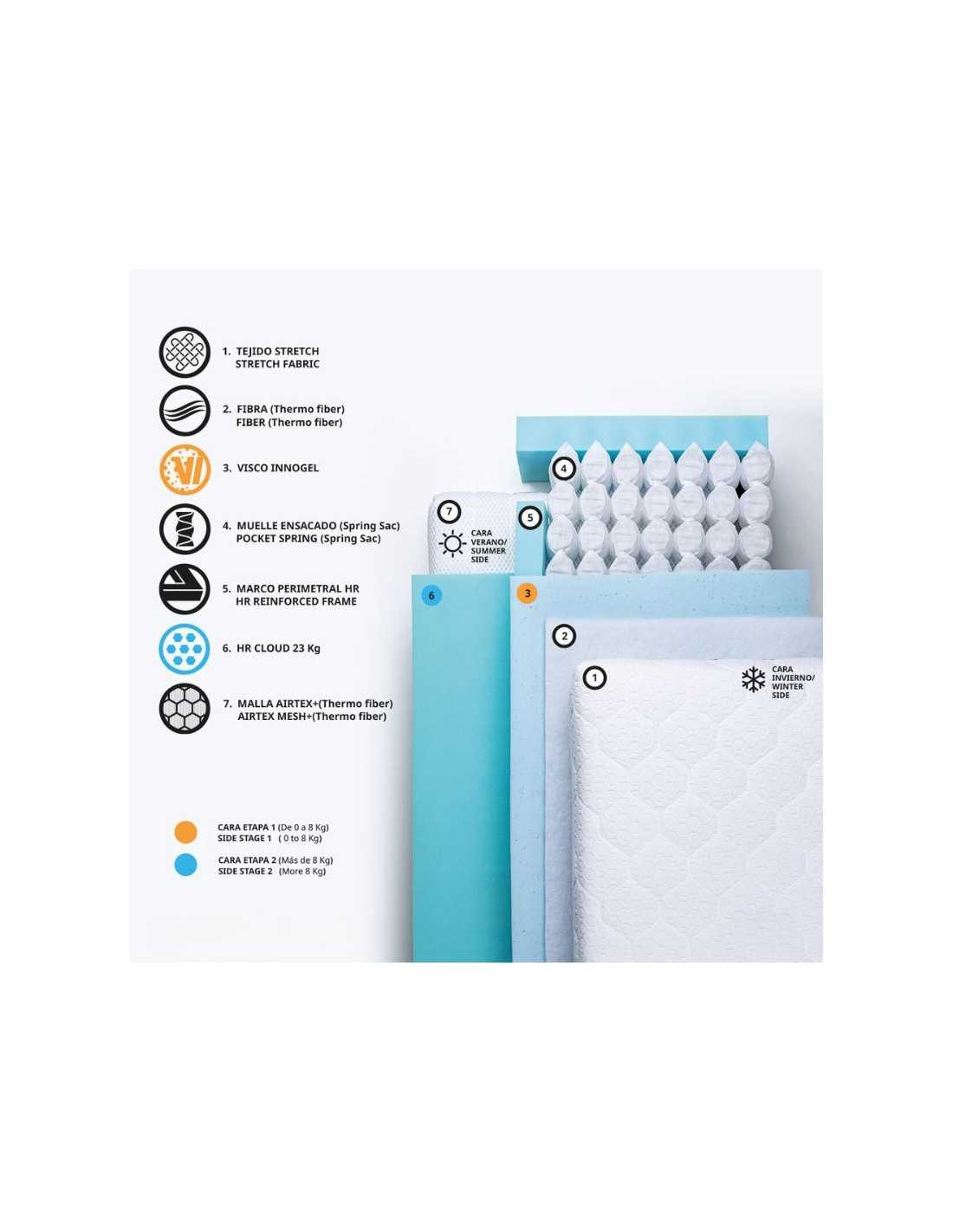 - Cara de invierno y de verano: thermofiber (fabricada con materiales que aportan un mayor calidez y mejora la adaptabilidad del colchón) para invierno y 3D (favorece la circulación del aire) para verano.