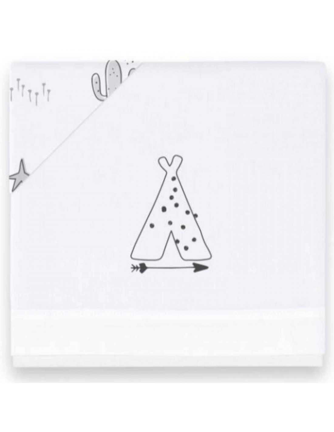 Juego de sábanas de punto orgánico para bebé compuesto por tres piezas, parte de la colección Indian de la prestigiosa marca Bimbidreams. Tiene un bonito diseño de tipis con una sábana bajera en estampado de tipis y encimera blanca.