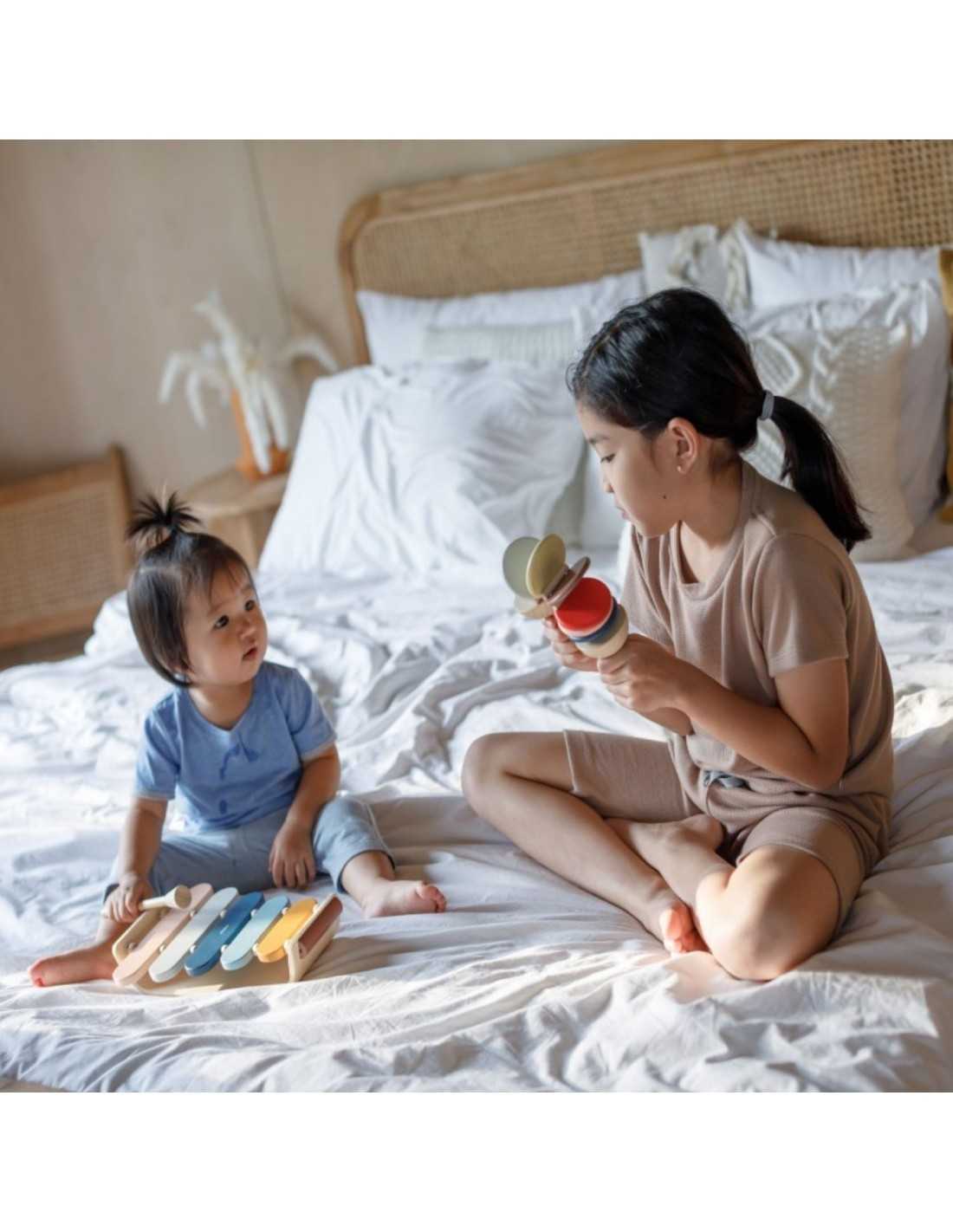 Podemos encontrar una variada colección de juguetes musicales de madera de PlanToys. Tambores, xilófonos, guitarras de madera, acordeón, pero también instrumentos como los cascabeles de percusión y las ocarinas.