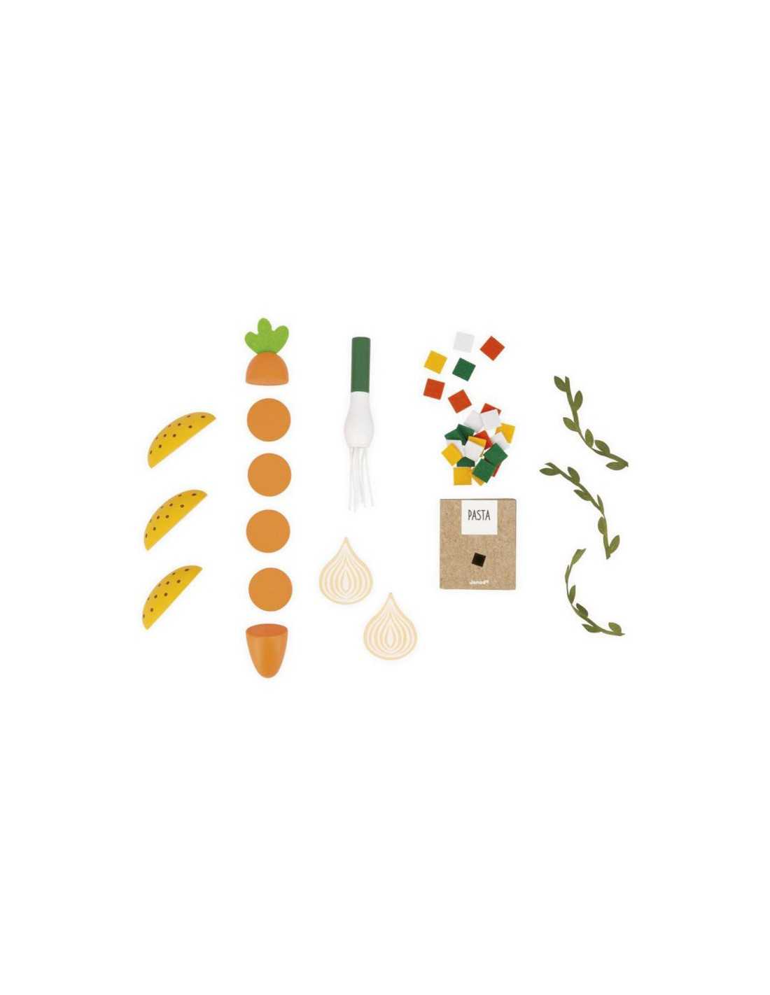 - Contenido: Olla con tapa, cucharón, batidora, verduras de madera, hierbas de fieltro y pasta multicolor