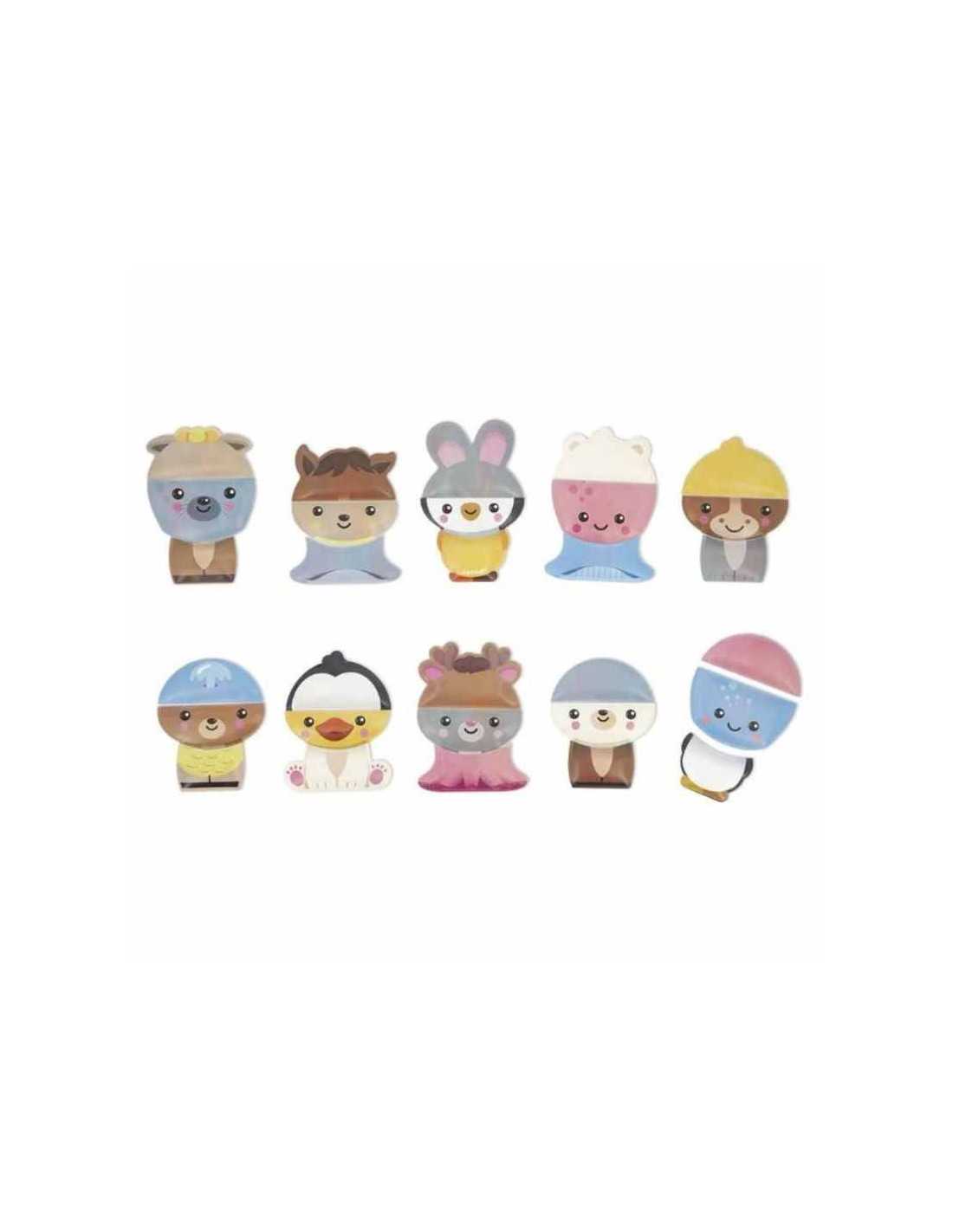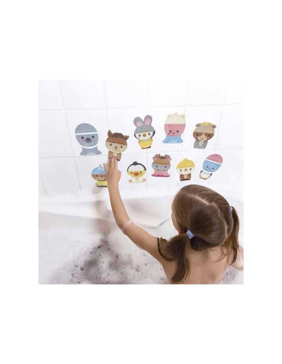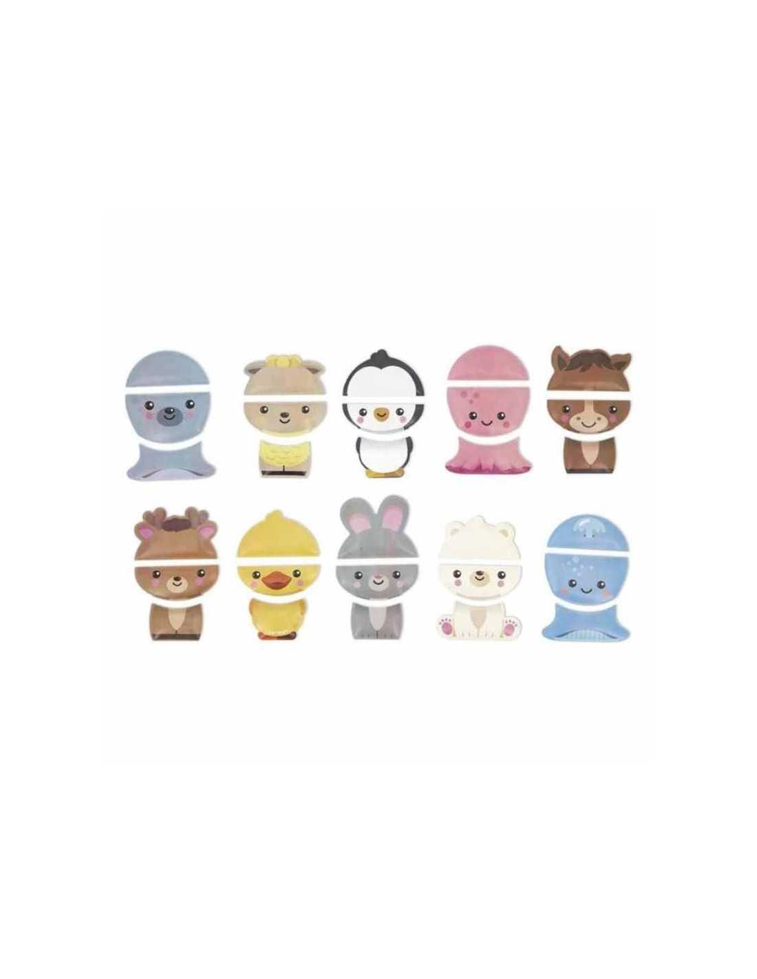 Este juguete para el baño de Janod incluye los siguientes animales compuestos por tres partes: un pinguino, una ballena, una foca, un pulpo, un oso polar, un reno, una oveja, un conejo, un pato y un caballo. Cuando las piezas estan mojadas se adhieren facilmente a la ceramica del baño.
