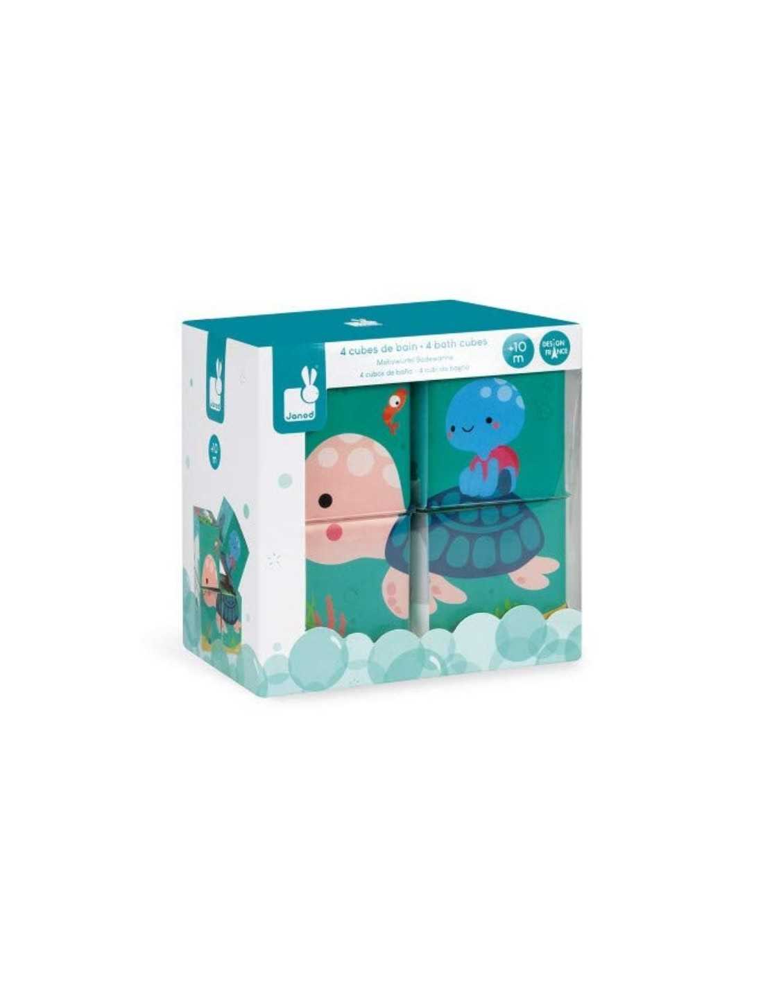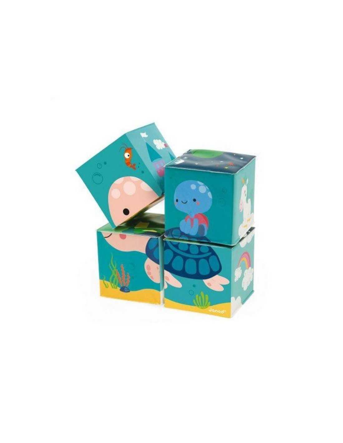 Cuatro cubos de baño ilustrados de Janod. Flotan, con varios diseños para recomponer imágenes. A partir de 10‑12 meses. Perfecto para jugar en el agua.