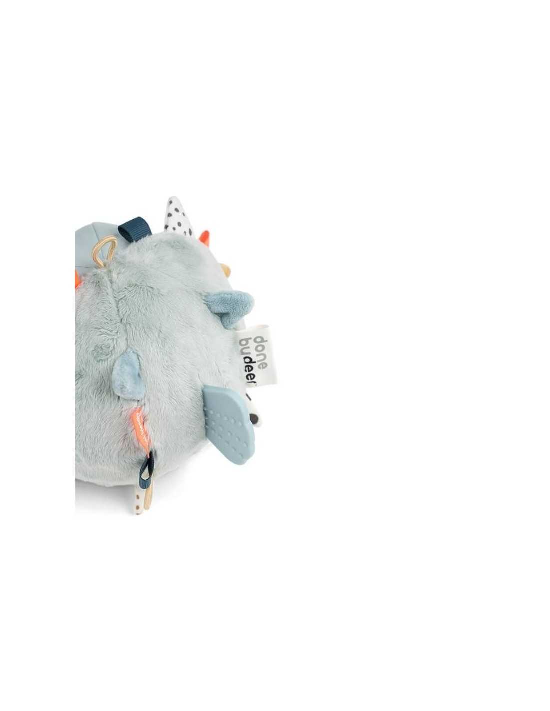 El juguetón pez globo de Done By Deer en una mezcla de colores suaves de azul, polvo y mostaza tiene muchas características para estimular las habilidades de nuestro bebé.