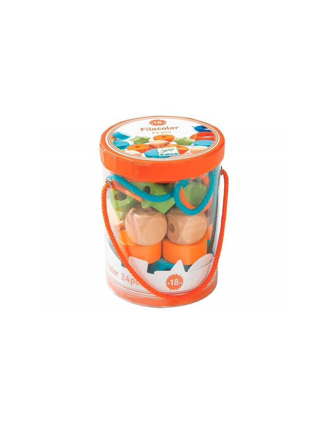 Este juego de primera edad de Djeco contiene una caja con 24 piezas diferentes y dos cordones para aprender a enhebrar y realizar divertidas creaciones.