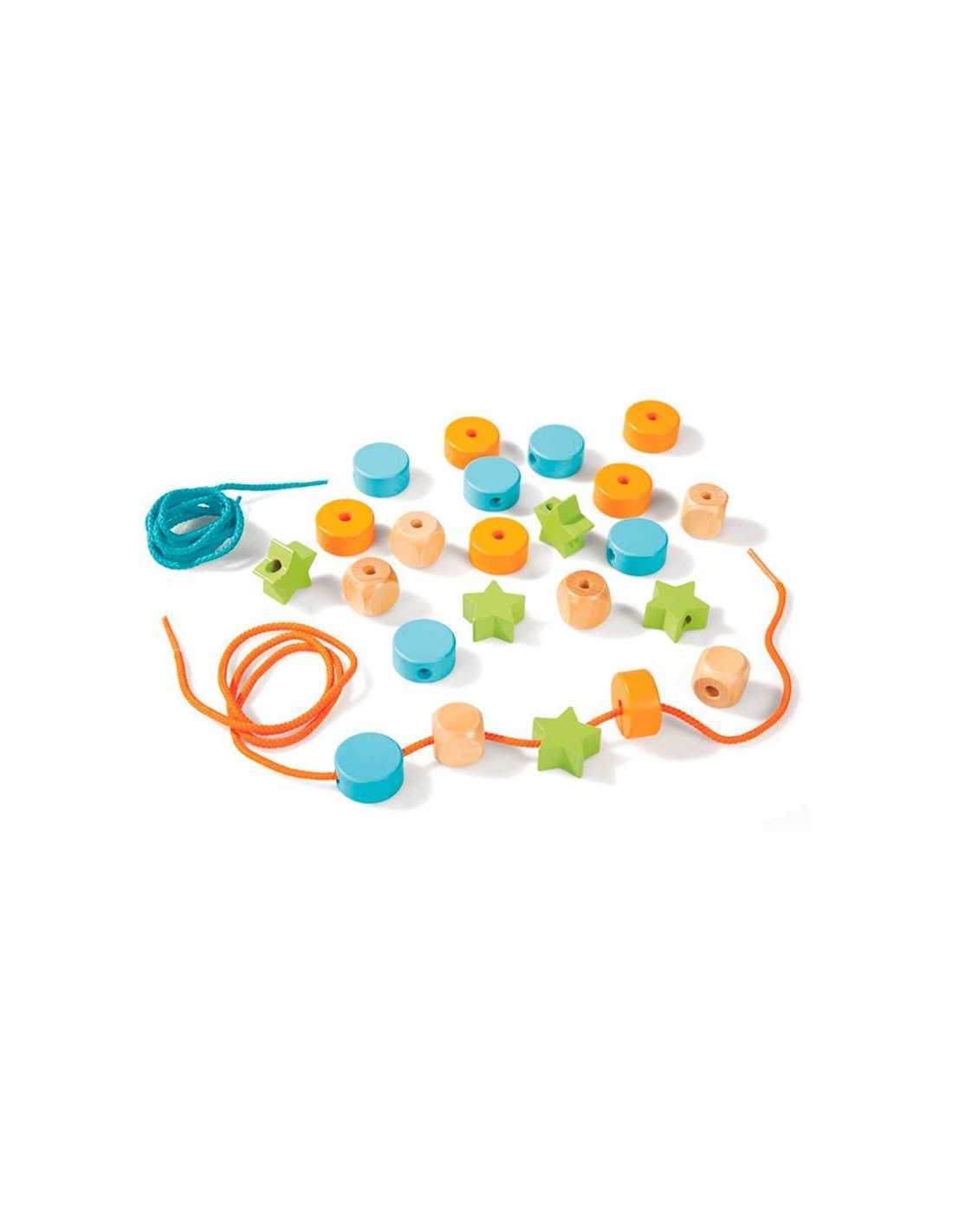 Los más pequeños tendrán que ser muy hábiles para enhebrar las distintas piezas geométricas en los cordones, haciendo divertidas combinaciones.