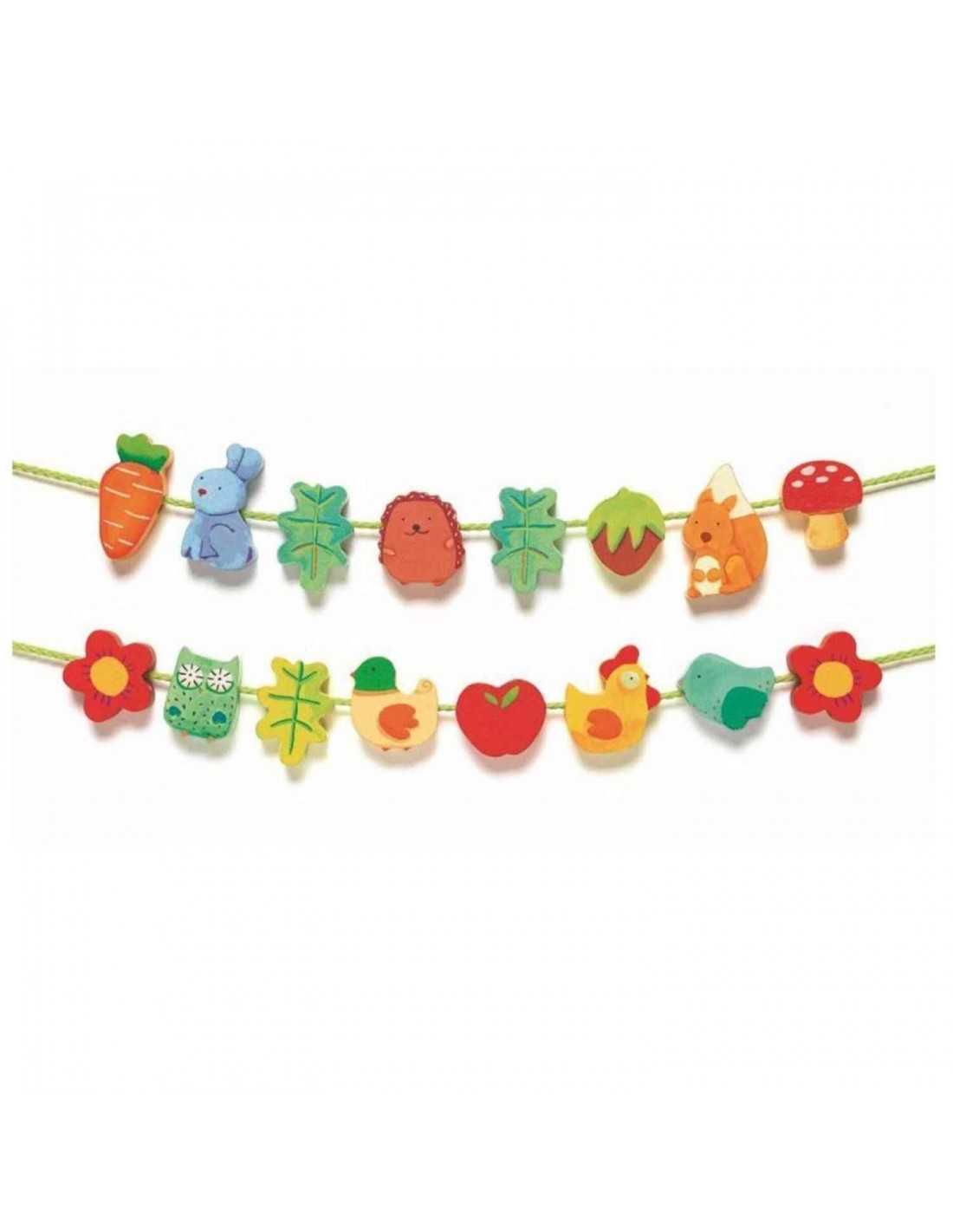 Este juego de primera edad de Djeco contiene una caja con 24 piezas diferentes y dos cordones para aprender a enhebrar y realizar divertidas creaciones.