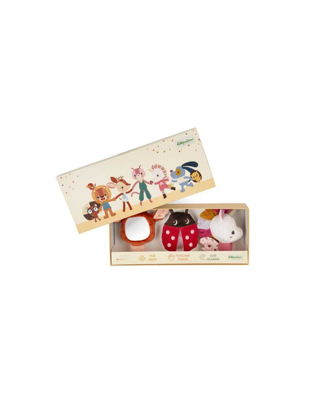 Set de descubrimiento sensorial Lena Lilliputiens con tres sonajeros preciosos para estimular los sentidos del bebé.