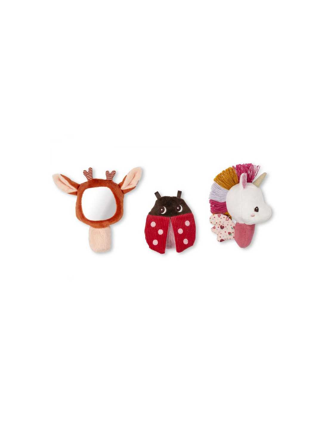 - Contenido: 3 sonajeros (Lena el unicornio, Stella el cervatillo y mariquita)