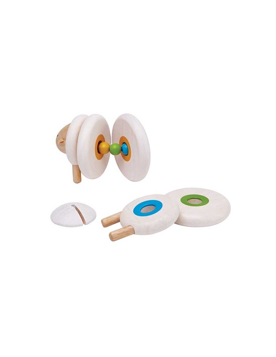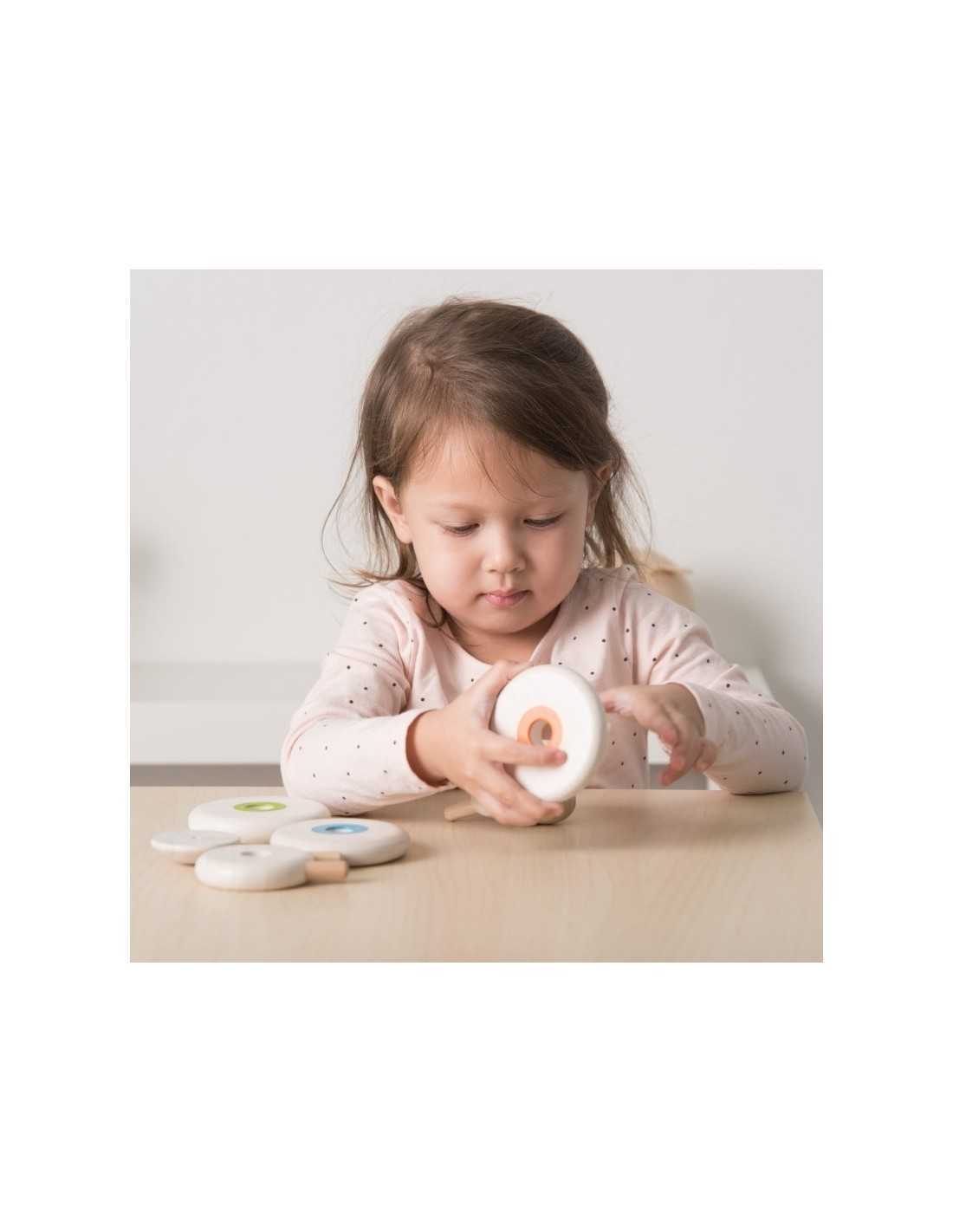 Podemos encontrar una variada colección de juguetes musicales de madera de PlanToys. Tambores, xilófonos, guitarras de madera, acordeón, pero también instrumentos como los cascabeles de percusión y las ocarinas.