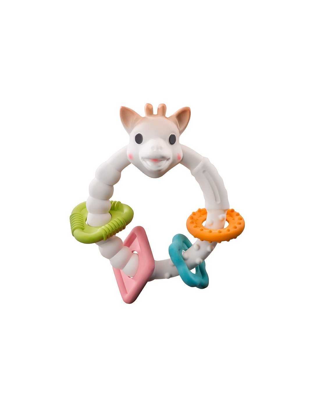 El anillo del sonajero mordedor Sophie la Jirafa dispone de 4 formas geométricas de distintos colores para llamar la atención del bebé mientras juega deslizándolas alrededor del anillo principal que es fácil de agarrar por las pequeñas manos del bebé.