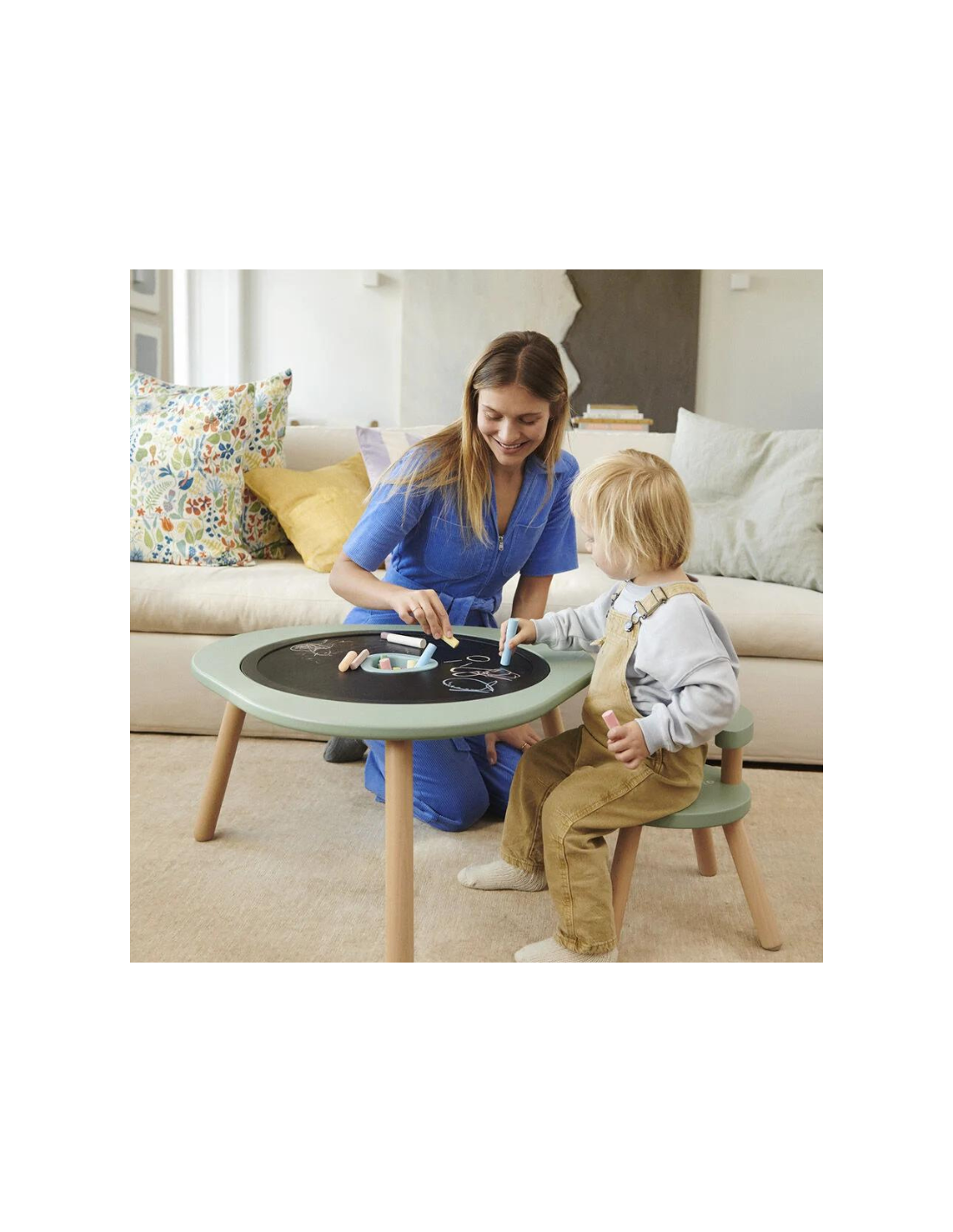 El tablero de doble cara es tanto versátil como funcional. Un lado presenta madera natural que armoniza con las patas, mientras que el otro lado tiene una pizarra perfecta para dibujar con tiza. ¡Ideal para que tus peques exploren su creatividad!