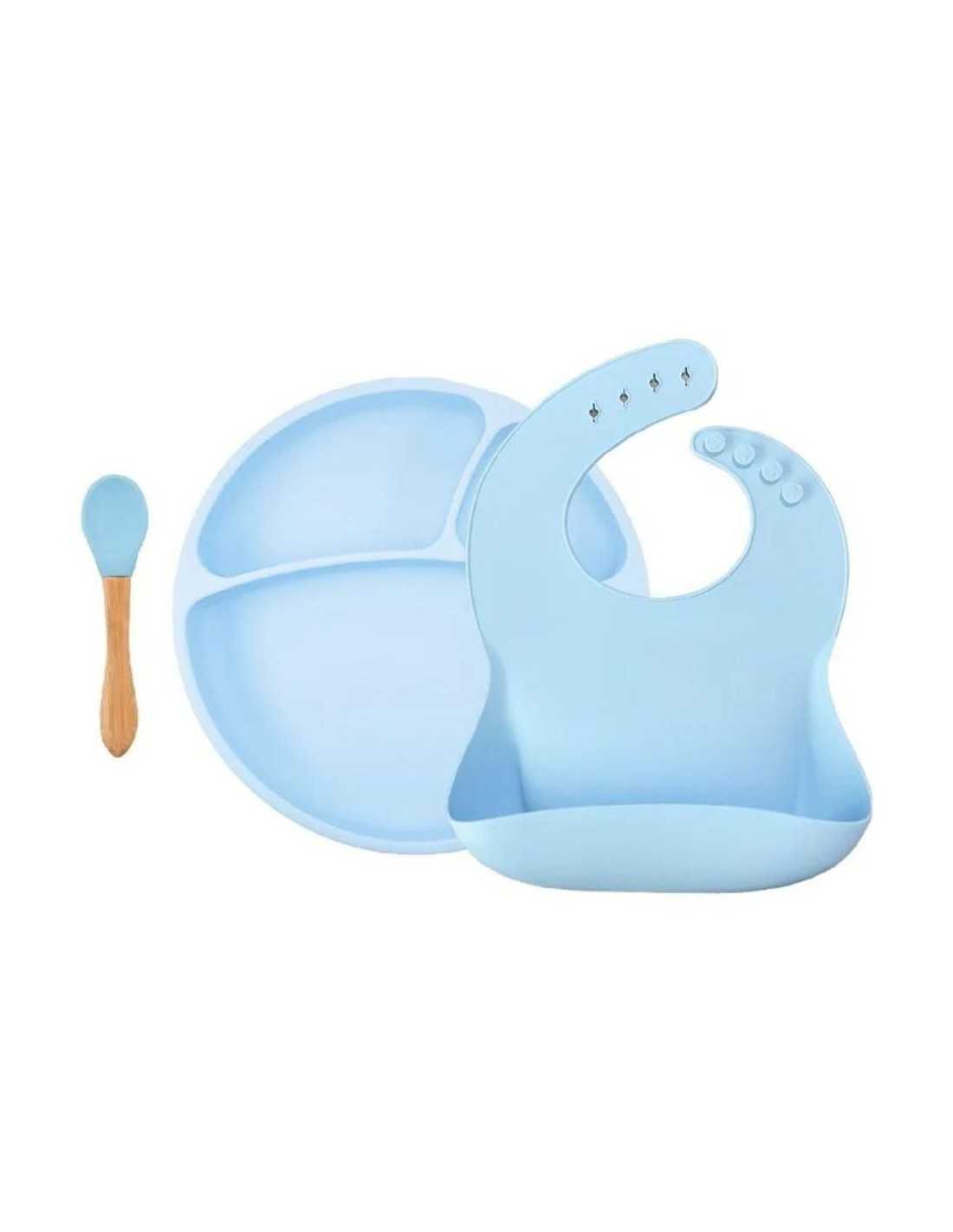 Este lindo juego de alimentación, incluye un plato con compartimientos para separar la comida de los pequeños, una cuchara de iniciación con punta de silicona y mango de bambú para mejor agarre y un babero fabricado en silicona irrompible, especialmente para ayudar a tu bebé en sus primeras comidas.