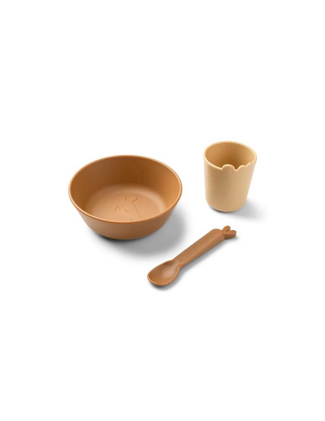 El práctico set de comida de Done by Deer viene con un vaso, un tazón y una cuchara con diseño de Croco, Raffi y Lalee, con los que tú bebé disfrutará mucho más sus primeras comidas.