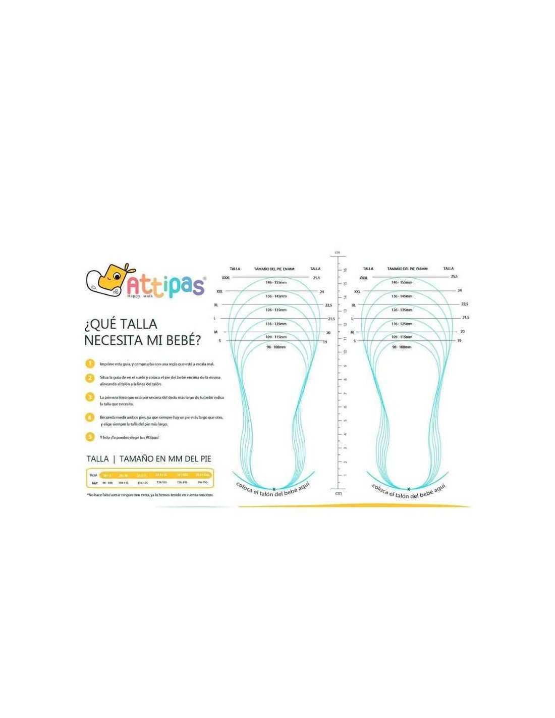 Para elegir correctamente la talla de Attipas, coloca el pie de tu bebé sobre un folio en el suelo, y toma la medida. Esta tabla de tallas te orientará para elegir correctamente. También puedes adquirir las plantillas de Attipas, con las que el pie del bebé quedará más recogido.